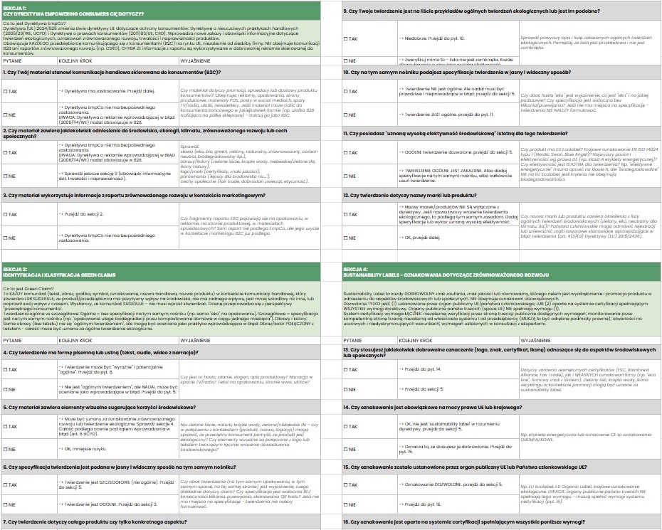 Przygotowaliśmy praktyczne narzędzie dla każdego, kto ma wpływ na to, jak produkt lub firma komunikuje się z konsumentem, m.in. działów prawnych i compliance, agencji reklamowych czy domów mediowych. Nasza kompleksowa anty-greenwashingowa checklista pomoże Ci samodzielnie sprawdzić każdy materiał B2C przed publikacją. Dzięki niej unikniesz greenwashingu oraz niezgodności z najnowszymi przepisami. To gotowe narzędzie pracy – nie poradnik do czytania, a filtr do przepuszczania materiałów. Otwierasz, bierzesz dowolny materiał B2C i przechodzisz punkt po punkcie!